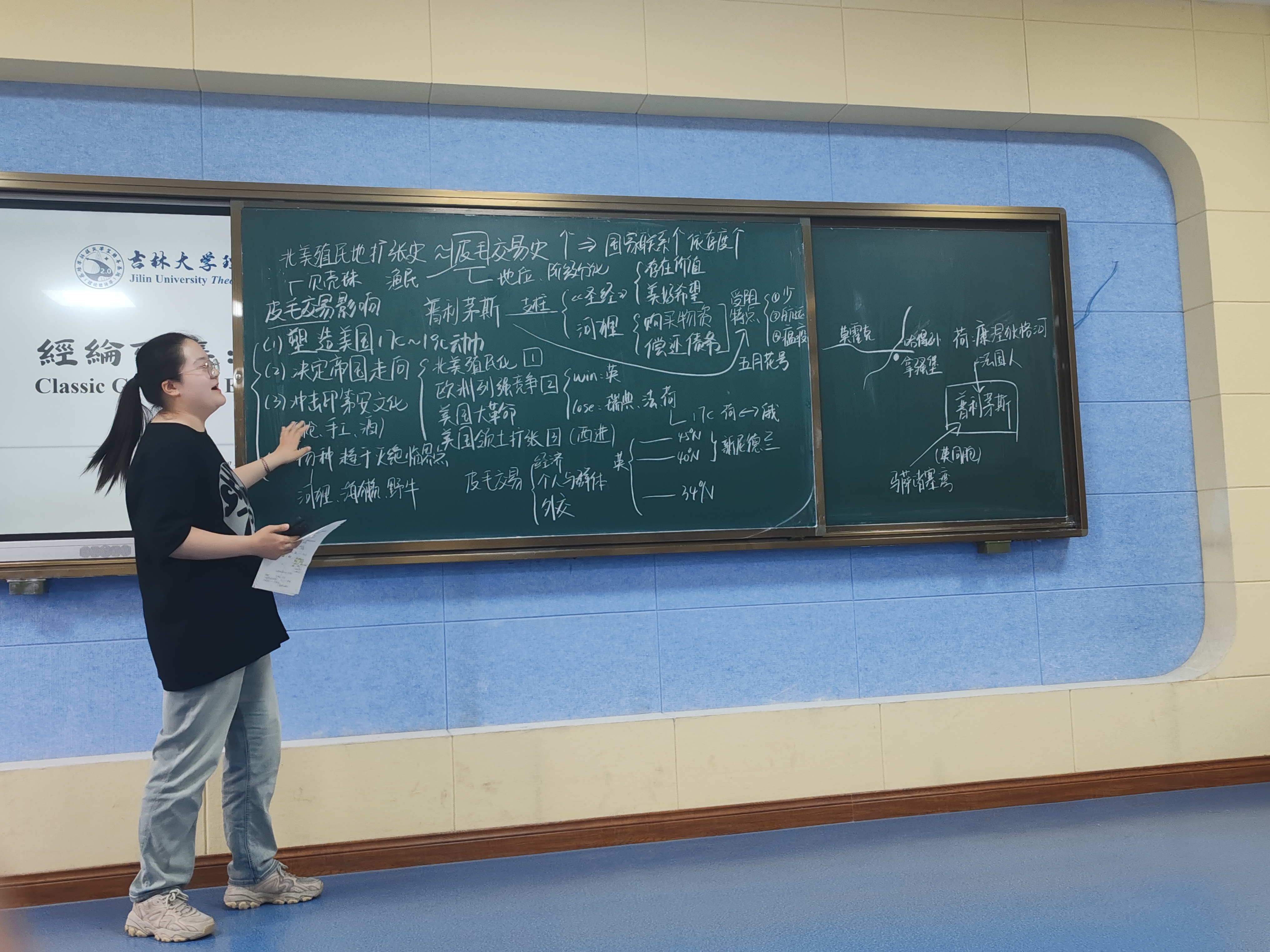 接下来进行分享的是王馨仪同学,她阅读的书籍是《县乡中国:县域治理现代化》。为了更清晰地介绍本书,她还在黑板上绘制了思维导图。她介绍道,本书从县域治理的内部视角出发,对县域治理体系、县域治理能力、县域治理自主空间、基层干部的发展和激励等内容做了生动和形象的解读。她在此次分享中融入了个人的经历体验与独特的经济学视角,使同学们更加深刻地感受到该书中“田野的灵感、野性的思维”。